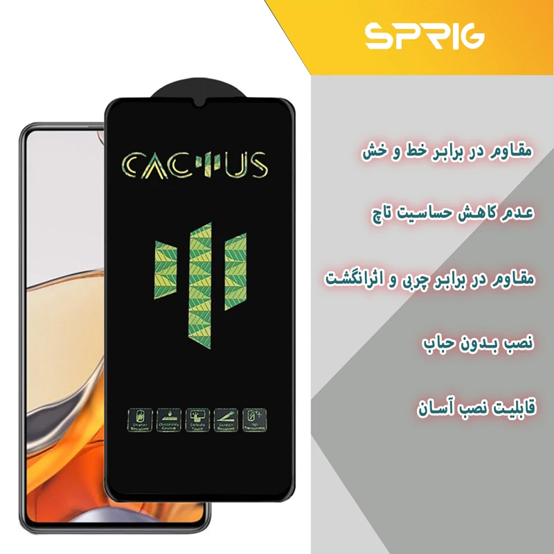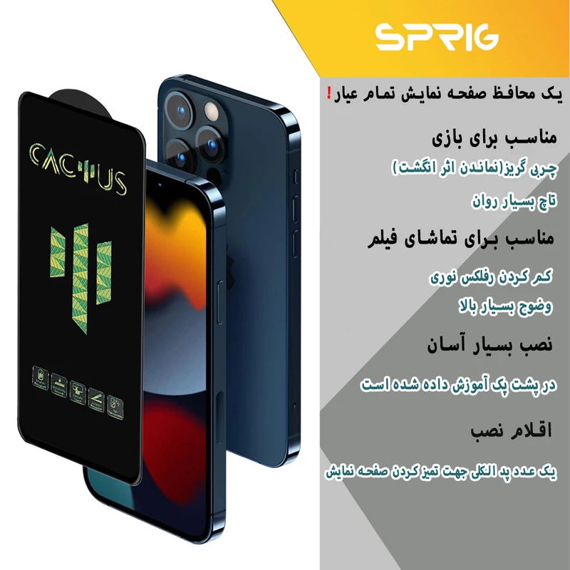 یکی از عمده ترین مشکلاتی که ممکن است گلس محافظ لنز دوربین برای دوربین داشته باشد این است که به علت اضافه شدن گلس محافظ بروی لنز ، کیفیت دوربین مقداری پایین بیاید که این امر درستی میباشد در صورتی که کیفیت گلس محافظ لنز استفاده شده از مرغوبیت کافی برخوردار نباشد. در مدل گوشی هایی که لنز عدسی آن ها به صورت تکی تغییر ارتفاع دارند به عبارت دیگر هر عدسی لنز به صورت جداگانه از سطح دوربین بیرون زدگی دارد در این حالت گلس لنز 3D فول مدل شیشهای به شکلی طراحی و ساخته میشود که دقیقاً در قسمت هایی که تغییر ارتفاع وجود دارد تراشیده شده و عدسی های لنز را درون خود جای میدهند تا سطحی صاف و یک دست شیشه ای ایجاد کند. لازم به ذکر است که اطراف لنز دوربین و روی عدسی های دوربین با شیشه پوشیده و محافظت میشود. در این مدل گوشی ها نصب این گلس لنز به مراتب راحت تر میباشد زیرا فقط کافیست عدسی های لنز را درون حفره های سر بسته گلس لنز فول قرار دهید و کمی فشار دهید تا کاملاً گلس لنز در جای خود نصب شود.محافظ صفحه نمایش گیمینگ اسپریگ مدل Cactus با حساسیت تاچ بالا عرضه میشود.این گلس از جنس شیشه میباشد.ویژگی منحصر به فرد این محافظ صفحه نمایش لغزندگی تاچ صفحه در هنگام بازی و تایپ کردن میباشد.