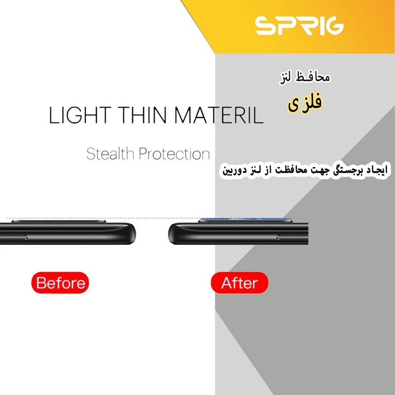 یک انتخاب مناسب برای حفاظت از لنز دوربین گوشیتان، محافظ لنز فلزی اسپریگ است که نحوه عملکرد آن متفاوت از سایر محافظ لنز ها می باشد. این لنز فلزی با ایجاد یک فاصله، از دوربین مراقبت می کند. در این نوع محافظ محل قرارگیری دوربین ها برش خورده و هیچگونه پوششی بر روی آن نیست و تنها با ایجاد فاصله از لنز محافظت می کند و آن را ایمن نگه می دارد به عبارت دیگر محل قرارگیری هر یک از لنز ها برش خورده و خالی می باشد؛ پس کیفیت دوربین ها بطور کامل و 100% حفظ می گردد و هیچگونه افتی در کیفیت عکس های شما بوجود نخواهد آمد. اصلی ترین مزیتی که این محافظ نسبت به سایر محافظ های لنز دوربین دارد جنس فلزی آن است که مقاومت آن را بسیار بالا می برد و در نتیجه باعث محافظت بهتر از دوربین می شود. پس از نصب این محافظ لنز فلزی، دیگر نگران افتادن گوشی از دست و شکستگی لنز نباشید.