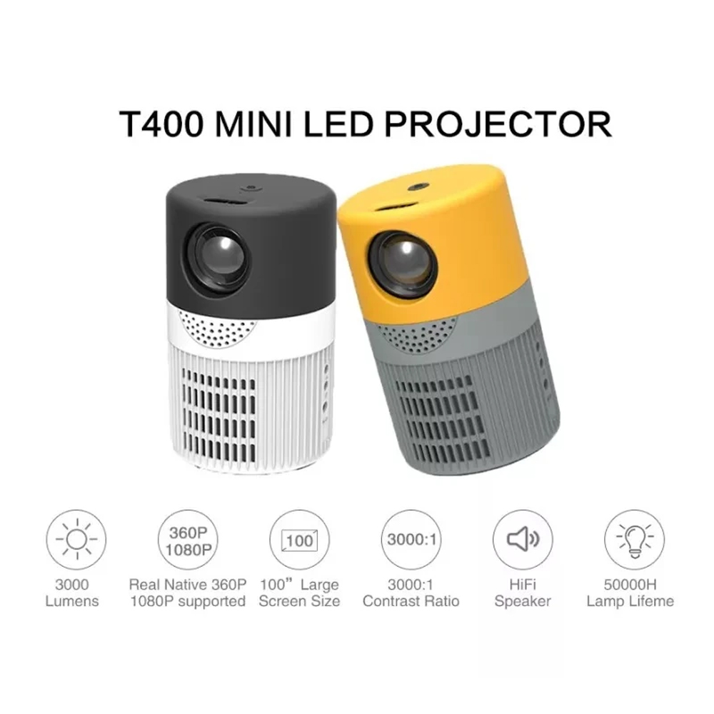 پروژکتور مدل Borrego Mini LED Projector T400 یک ویدئو پروژکتور کوچک با کارایی بالا و کیفیت تصویر فوق العاده و گزینه های اتصال گسترده است. با وضوح تصویر 480*360 تماشای فیلم و ارائه بازی را تبدیل به یک عمل لذت بخش میکند. با شدت روشنایی 3000 توانایی ارائه تصاویر واضح را دارد. در قسمت بالایی دستگاه پیچ تنظیم فوکوس قرار گرفته که میتوانید فوکوس را بصورت دستی تنظیم کنید. اندازه پروژکشن 50 تا 100 اینچ با فاصله 0.5 تا 4.0 متر ارائه دهد. با پورت های ورودی AV/USB/HDMI امکان اتصال به دستگاه های مختلف را فراهم میکند. شما میتوانید از پورت HDMI برای اتصال به کنسول بازی استفاده کنید. طول عمر لامپ 30000 ساعت هست که هزینه های نگهداری مربوط به تعویض لامپ را در بلند مدت کاهش میدهد. بلندگوهای داخلی امکان انتقال همزمان صدا و تصویر را دارند. برای استفاده از آن نیازی به اسپیکر نیست و تجربه ی صدای غنی و بی نقصی را ارائه میدهد. کاربرد این محصول به عنوان سینمای خانگی و حتی به عنوان یک ابزار کارامد در جلسات و کنفرانس ها میباشد. پروژکتور مدل Borrego Mini LED Projector T400 یک انتخاب ایده آل برای طیف وسیعی از کاربردهاست.