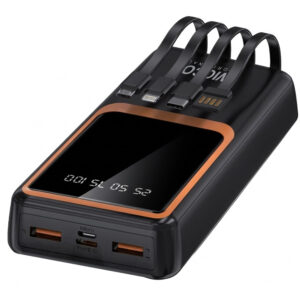 پاوربانک ویکو (Wiccoo) مدل WP-13 با ظرفیت ۱۰,۰۰۰ میلیآمپر ساعت، توان ۲۲.۵ وات فست شارژ، یک انتخاب قدرتمند و کارآمد برای شارژ انواع دستگاههاست. این پاوربانک دارای چندین پورت خروجی برای اتصال همزمان چند دستگاه است و از همه مهمتر، به چهار کابل متصل داخلی (USB، USB-C، Micro USB و Lightning) مجهز شده تا بدون نیاز به حمل کابل اضافه، همیشه آماده استفاده باشد. همچنین یک صفحه نمایش دیجیتال روی بدنه قرار دارد که درصد دقیق شارژ پاوربانک را به صورت عددی نمایش میدهد تا همیشه میزان انرژی باقیمانده را بدانید. طراحی کاربردی و ظرفیت بالا این مدل، آن را به همراهی مطمئن برای سفر و استفاده روزمره تبدیل کرده است. این پاوربانک دارای چراغ LED است که میتوانید در مواقع نیاز از آن استفاده کنید.