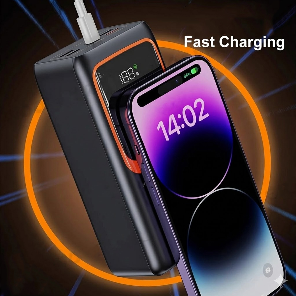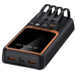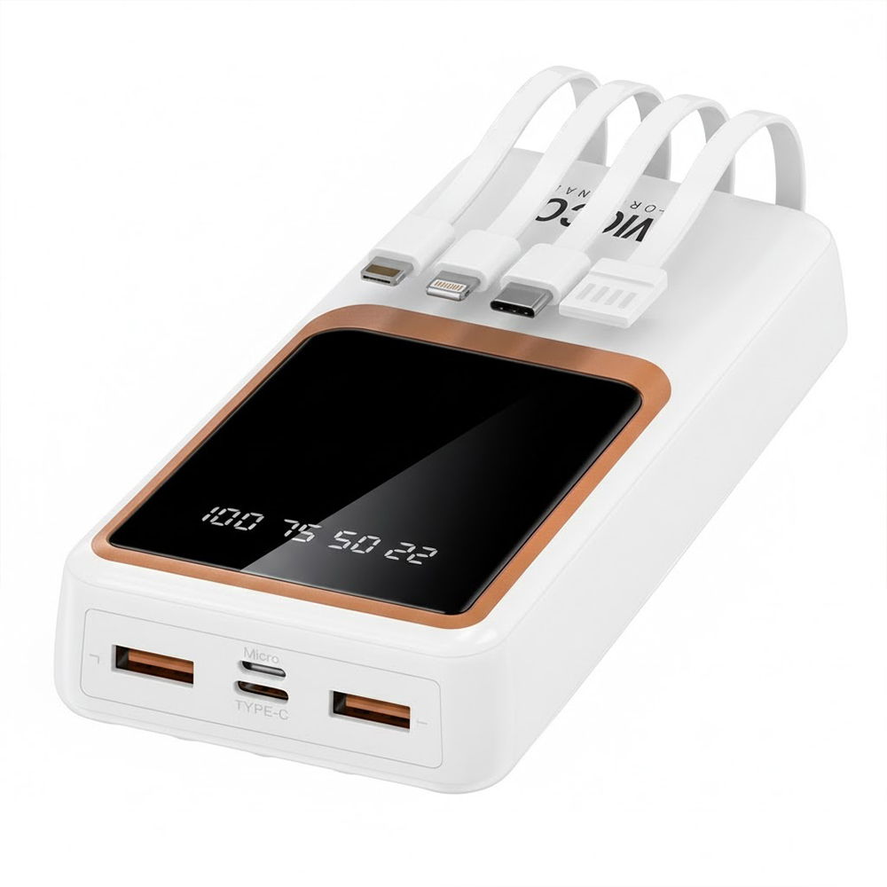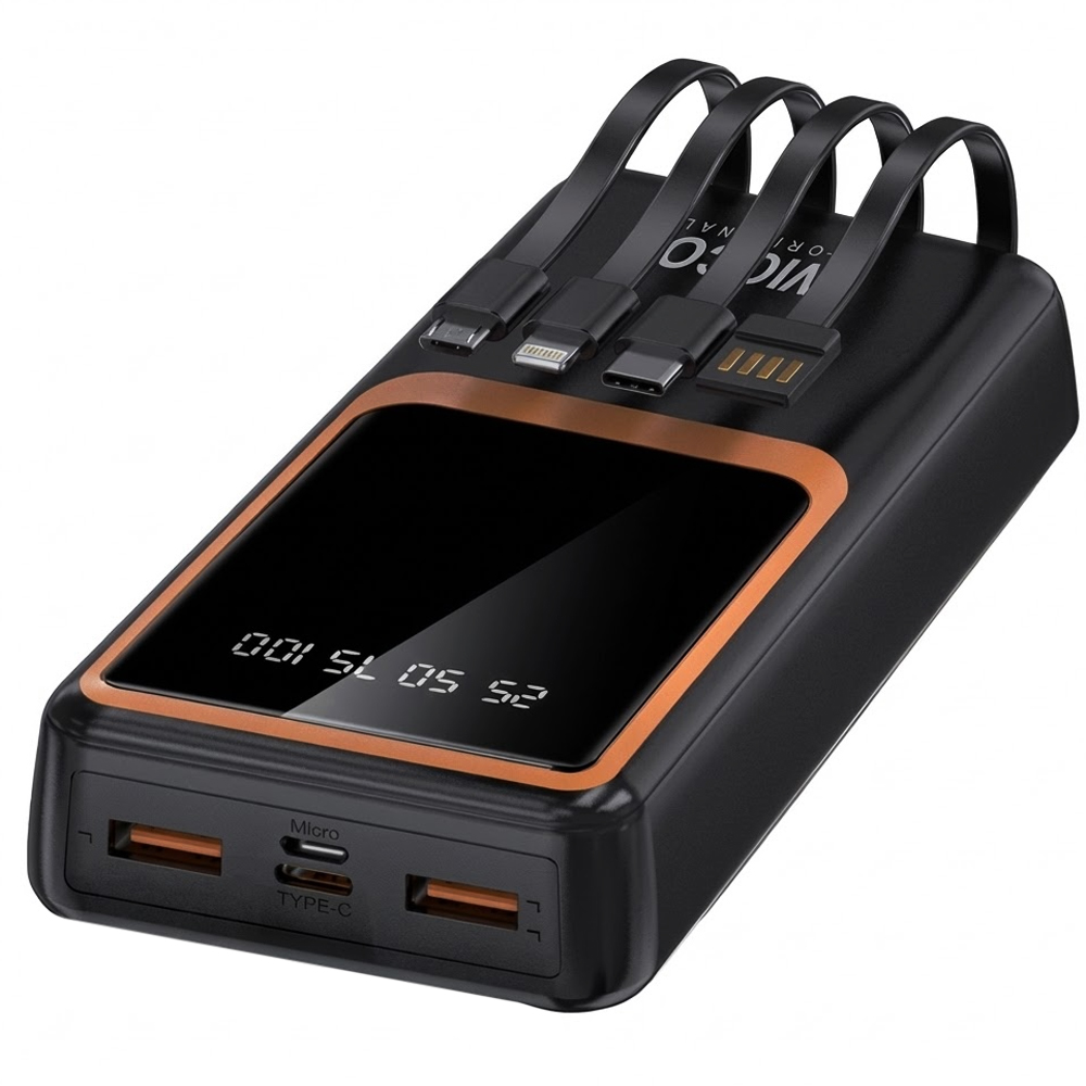 پاوربانک ویکو (Wiccoo) مدل WP-32 با ظرفیت ۳۰,۰۰۰ میلیآمپر ساعت، توان ۲۲.۵ وات فست شارژ، یک انتخاب قدرتمند و کارآمد برای شارژ انواع دستگاههاست. این پاوربانک دارای چندین پورت خروجی برای اتصال همزمان چند دستگاه است و از همه مهمتر، به چهار کابل متصل داخلی (USB، USB-C، Micro USB و Lightning) مجهز شده تا بدون نیاز به حمل کابل اضافه، همیشه آماده استفاده باشد. همچنین یک صفحه نمایش دیجیتال روی بدنه قرار دارد که درصد دقیق شارژ پاوربانک را به صورت عددی نمایش میدهد تا همیشه میزان انرژی باقیمانده را بدانید. طراحی کاربردی و ظرفیت بالا این مدل، آن را به همراهی مطمئن برای سفر و استفاده روزمره تبدیل کرده است.