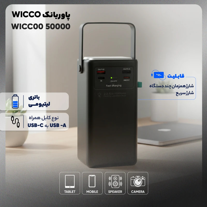 پاوربانک ۲۲.۵ وات مدل WICCOO WP-50 با ظرفیت بسیار بالای ۵۰۰۰۰ میلیآمپرساعت گزینهای ایدهآل برای افرادی است که در طول روز به انرژی پایدار و طولانیمدت نیاز دارند. این محصول با بهرهگیری از باتری لیتیومپلیمری، تجربهای مطمئن برای شارژ انواع گوشیهای موبایل، تبلتها، اسپیکرهای بلوتوثی و حتی دوربینها فراهم میکند. طراحی مقاوم و بدنه پلاستیکی، همراه با ابعاد استاندارد، استفاده از آن را در سفر، محیط کار و شرایط روزمره آسان میکند. وزن ۱۰۰۰ گرمی نشاندهنده ظرفیت بالای دستگاه است و در مقابل، عملکرد قدرتمند آن در مواقع ضروری کاملاً ارزشمند خواهد بود. وجود شش درگاه خروجی USB-A و USB-C، امکان شارژ همزمان چندین دستگاه را فراهم میکند و کاربران با سرعت مناسب قادر به تامین انرژی گجتهای خود خواهند بود. ورودی USB-C نیز روند شارژ پاوربانک را به شکل سریعتری انجام میدهد. شدت جریان ۳.۰ آمپر، توان خروجی ۲۲.۵ وات و تکنولوژی شارژ استاندارد، عملکردی قابلاعتماد ارائه میدهد. چیپست هوشمند داخلی با مدیریت جریان و ولتاژ، از دستگاهها در برابر نوسان، گرمای بیش از حد، اتصال کوتاه و سایر خطرات احتمالی محافظت کرده و تجربه شارژی امن را تضمین میکند. مدیریت هوشمند توان، تخصیص جریان، شارژ سریع و سیستمهای حفاظتی متعدد، این پاوربانک را به ابزاری کارآمد برای استفاده حرفهای تبدیل کردهاست. چراغقوه تعبیهشده نیز با دوبار فشردن دکمه پاور فعال میشود و در شرایط اضطراری کاربرد زیادی دارد. نمایشگر LED میزان شارژ باقیمانده را بهصورت دقیق نشان میدهد و سازگاری گسترده محصول با تمام دستگاهها، آن را به انتخابی مناسب برای کاربران پرمصرف تبدیل کردهاست.