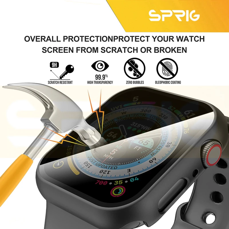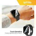 کاور اسپریگ مدل DG Privacy ، بدنهای از جنس پلیکربنات دارد. این متریال نسبت به TPU سختتر بوده و با اینکه نسبت به آن انعطافپذیری کمتری دارد ولی محافظ قویتر و مستحکمتری محسوب میشود. هرچند سخت بودن این کاور اختلالی در نصب آن ایجاد نمیکند و با کمی دقت میتوان به آسانی آن را روی ساعت نصب نمود. برشکاری دقیق کاور در قسمت دکمهها و پورتها سبب شده تا در دسترسی به آنها محدودیتی ایجاد نشود. علاوه بر این ضخامت کم این محصول اپل واچ شما را بیش از حد برجسته نمیکند و کاملا با ابعاد ساعت هماهنگ است.گلس حرارتدیده متصل به این کاور نیز با بهرهگیری از یک طراحی هوشمندانه به خوبی فشار لمس را به صفحه نمایش ساعت انتقال میدهد و تا حد ممکن اختلالی در عملکرد تاچ ایجاد نمیکند. این گلس با داشتن فناوری Privacy قابلیت ویژه محدود کردن زاویه دید ساعت را دارا میباشد به گونه ای که فقط شما با زاویه مستقیم می توانید از روبرو صفحه نمایشگر گوشی خود را واضح و شفاف ببینید در غیر این صورت افراد دیگر که به صورت زاویه دار به صفحه ساعت نگاه میکنند چیزی جز صفحه تاریک و سیاه نمی بینند