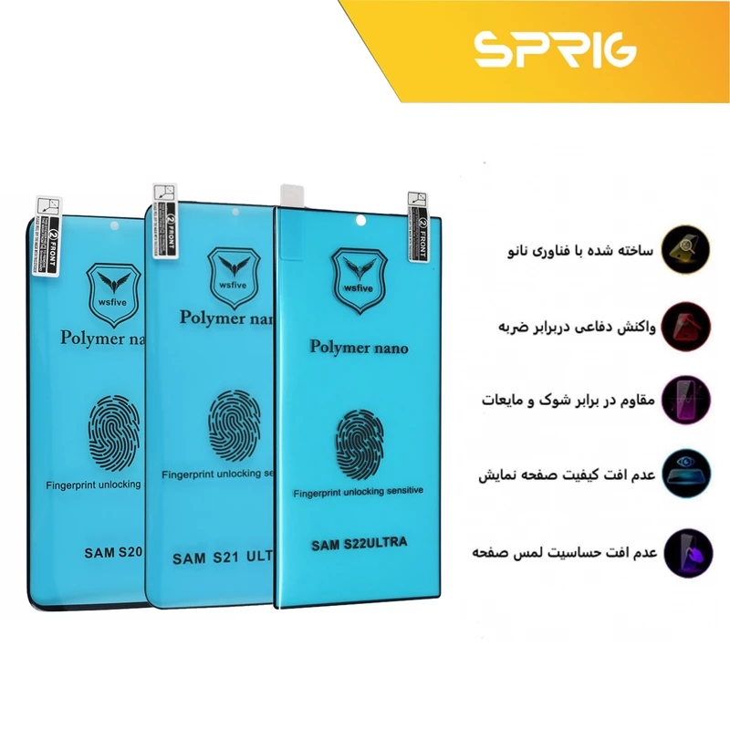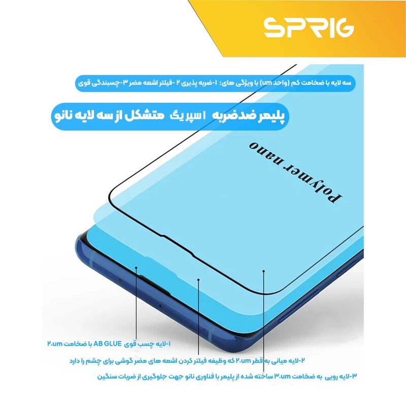 محافظ صفحه نمایش نانو پلیمر اسپریگ از نوع پلیمری می باشد. این قابلیت پلیمری بودن گلس، به جهت وجود مولکول هایی متصل به هم، موجب شده است تا از شکسته شدن گلس در هنگام ضربات بسیار محکم جلوگیری کند. از طرفی این نوع گلس دارای ضخامت کم می باشد. به همین خاطر، در وضوح صفحه نمایش هیچ مشکلی ایجاد نمی کند.گلس نانو، نسبت به گلس های شیشه ای معمولی معمولا سطح بیشتری از صفحه نمایش را می پوشاند.