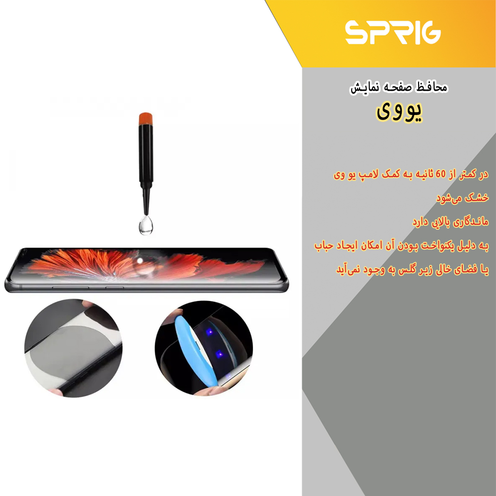 گلس یووی حریم شخصی اسپریگ نوع جدیدی از گلس های موجود در بازار است که مخصوص تلفن های همراه با صفحه نمایش خمیده تولید شده است و به همراه لامپ یووی و چسب مخصوص نصب گلس یووی ارائه میشود. چسب مخصوص نصب یووی در کمتر از 60 ثانیه به کمک لامپ یووی خشک می شود و این سرعت عمل را می توان یکی از مزایای این گلس به شمار آورد.