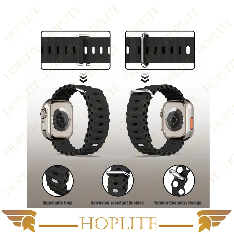 بند هاپلایت مدل Ocean سبک وزن، بادوام و قابل تنظیم، به طور یکپارچه از دو لایه پارچه، بدون دوخت بافته شده می باشد. از قلابهای تیتانیومی مقاوم در برابر خوردگی و بدون زنگ زدگی برای اتصال ایمن استفاده می کند. نوار ساخته شده از جنس سیلیکون سازگار با پوست، قابل تنفس، مقاوم در برابر عرق و مقاوم در برابر آب میباشد. همچنین با قلاب تیتانیوم ، سبک وزن میباشد. مناسب برای کوهنوردی، پیاده روی، دویدن، صخره نوردی، دویدن، دوچرخه سواری و سایر ورزش های ماجراجویی در فضای باز میباشد. بندهای طراحی شده برای ساعت اپل دارای یک هوک فلزی قابل تنظیم برای انعطاف پذیری و ایمن کردن بند شماست.