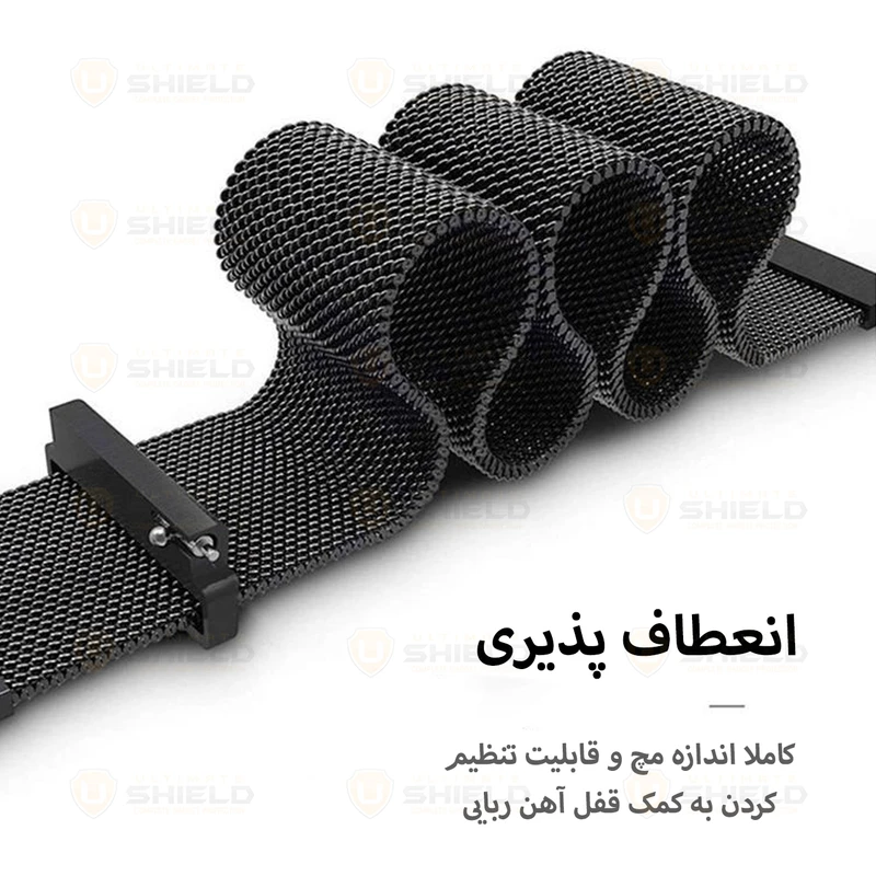 بند آلتیمیت شیلد مدل Milanese Set از جنس استیل ضد زنگ ساخته شده و قفل مغناطیسی آن سریع و راحت باز و بسته میشود. همراه بند یک کاور شفاف از جنس پلیکربنات سخت ارائه میشود که در برابر خط و خش و ضربه مقاومت بالایی دارد. طراحی کاور بهصورت Built-in بوده و به بند متصل است و جدا نمیشود و در عین حال ظاهر ساعت را شیک و یکپارچه حفظ میکند. این ترکیب سبک، مقاوم و مناسب برای استفاده روزمره و رسمی بسیار مناسب است.