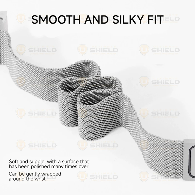 اگر بهدنبال ترکیبی از زیبایی، کیفیت و راحتی هستید، بند آلتیمیت شیلد انتخابی ایدهآل برای شماست. این بند از جنس استیل ضد زنگ بافتهشده و با تراکم بالا ساخته شده که در عین ظرافت، دوام بسیار بالایی دارد و در برابر رطوبت، تعریق و فرسایش مقاوم است. طراحی خاص بافتدار آن، جلوهای شیک و کلاسیک به ساعت شما میدهد و بهراحتی با انواع استایلهای روزمره یا رسمی هماهنگ میشود. یکی از ویژگیهای برجسته این بند، قفل مگنتی قوی و ایمن آن است که امکان تنظیم دقیق اندازه بند را فراهم میکند و بدون نیاز به ابزار خاص، میتوان آن را در عرض چند ثانیه نصب یا جدا کرد. خاصیت انعطافپذیری بالا و وزن سبک بند نیز باعث میشود استفاده از آن در طول روز بسیار راحت باشد و احساس سنگینی یا فشار روی مچ ایجاد نکند. این بند انتخابی مناسب برای افرادی است که میخواهند ظاهر ساعت هوشمند خود را ارتقا دهند و در عین حال، راحتی و کارایی را از دست ندهند.